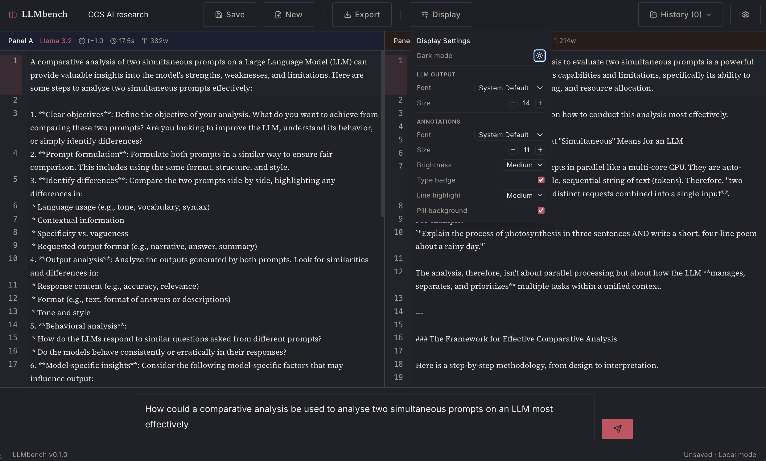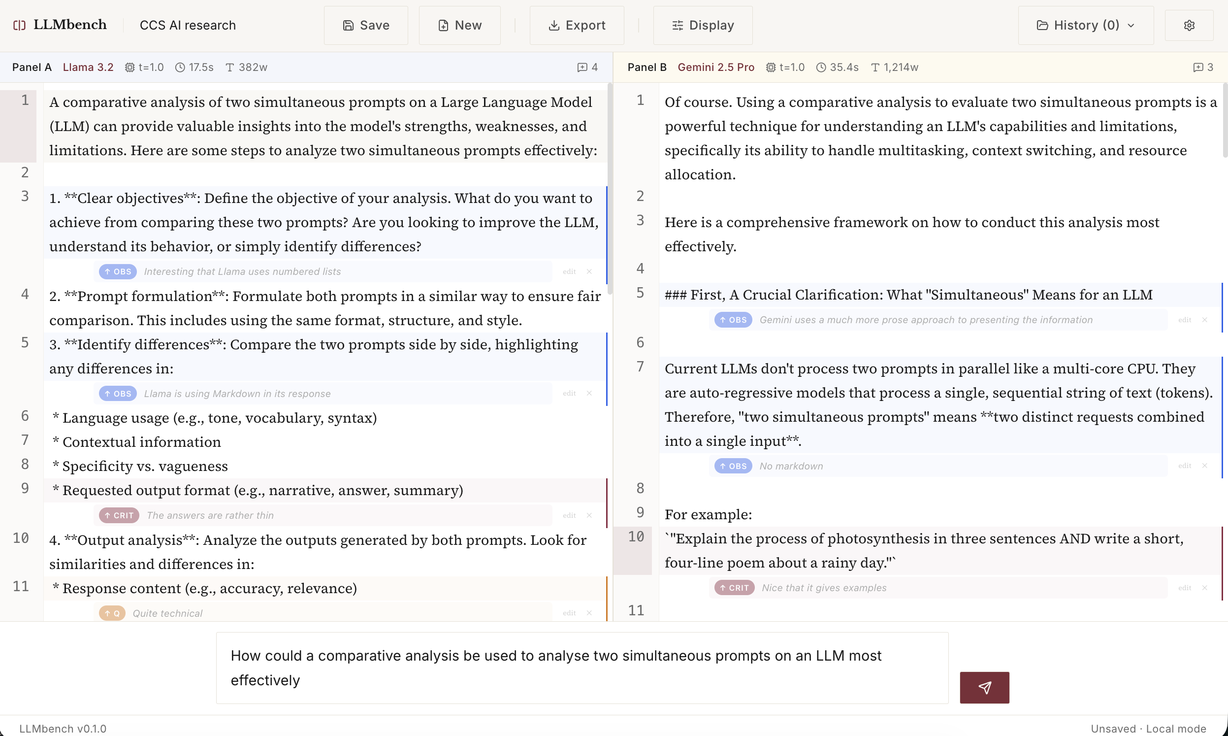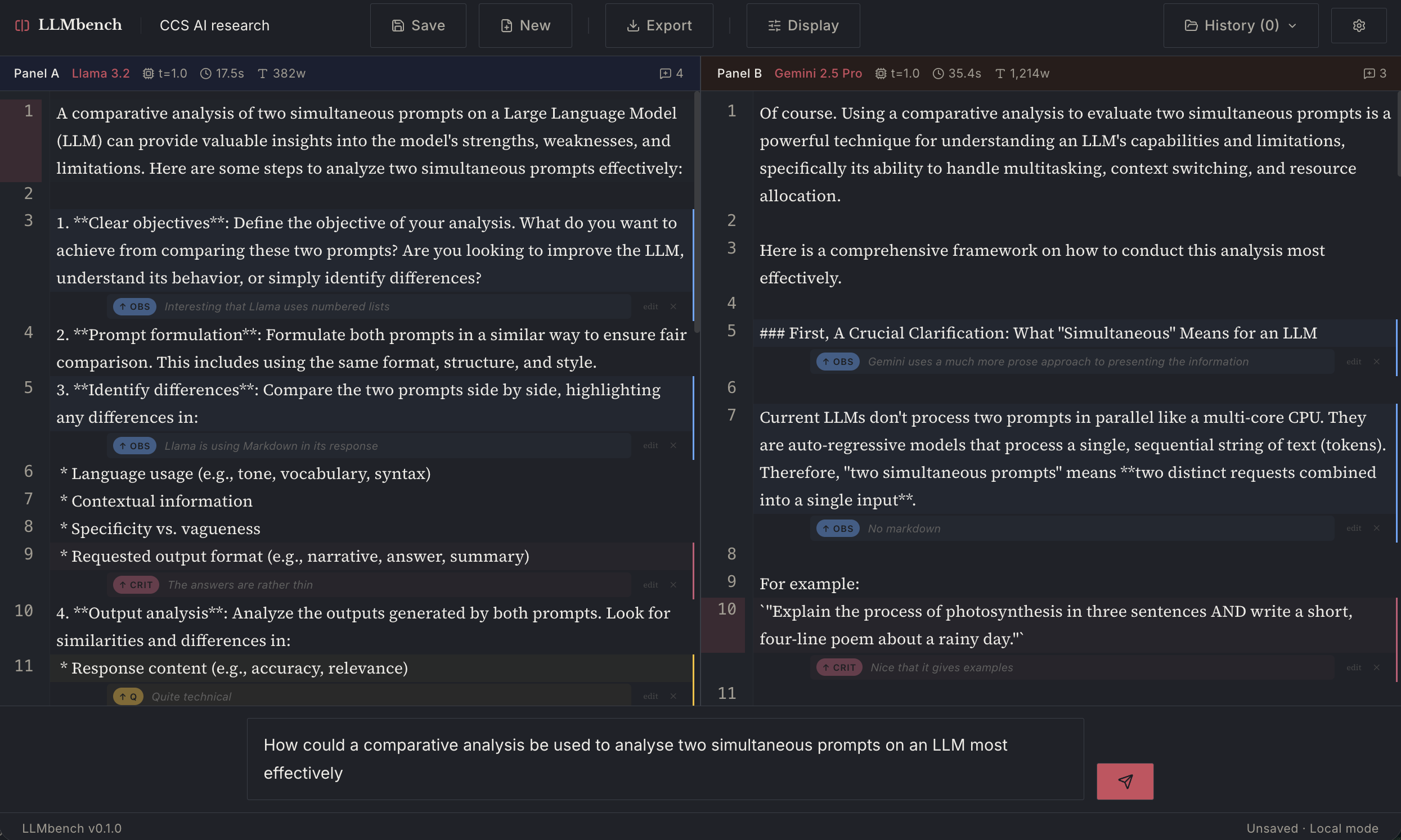 After the success of the CCS workbench, I have used the lessons learned from that tool to vibe code another new tool I call LLMbench. This new tool allows you to prompt two LLMs simultaneously with the same prompt and then use the reply to analyse it with annotations. These can then be exported to JSON/text or PDF for later use.