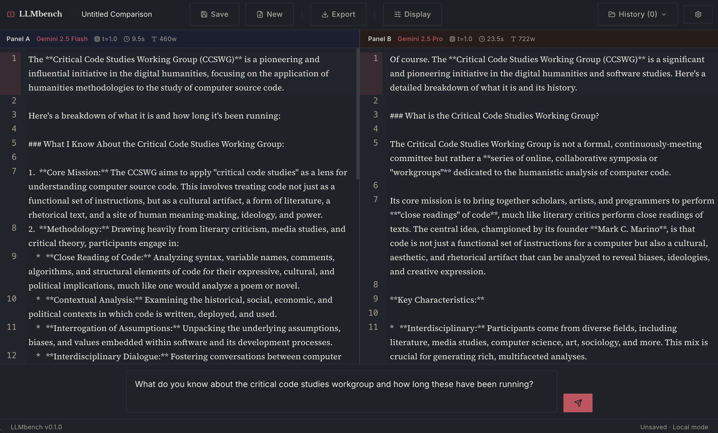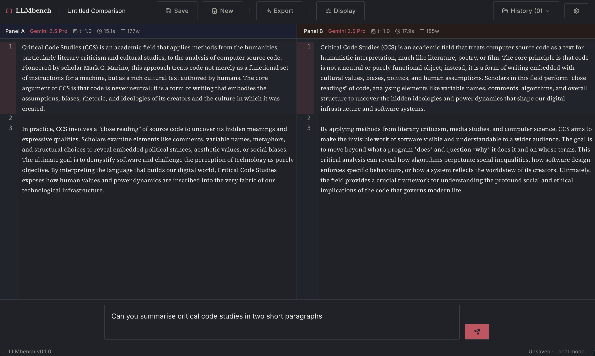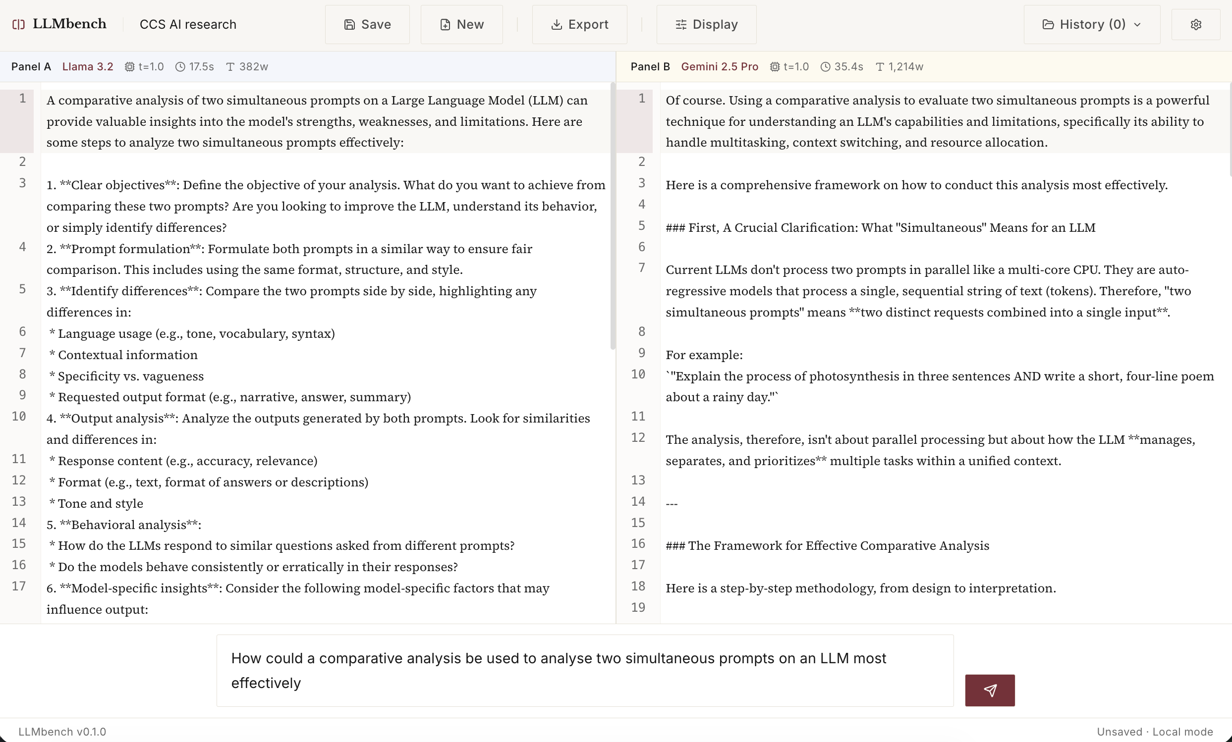 After the success of the CCS workbench, I have used the lessons learned from that tool to vibe code another new tool I call LLMbench. This new tool allows you to prompt two LLMs simultaneously with the same prompt and then use the reply to analyse it with annotations. These can then be exported to JSON/text or PDF for later use.